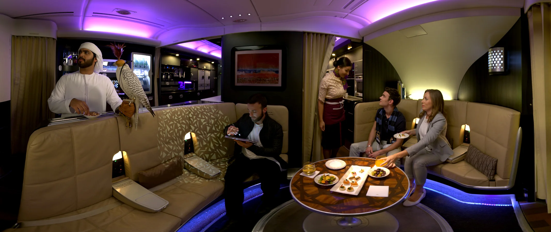In the single most challenging and complicated shoot I think I will ever do, we had to ground an actual Airbus A380 for 3 days in Abu Dhabi to shoot the film - and it was leaving at midnight on day 3 to fly to London whether we were done or not. Shooting a normal film on a plane is no easy task, but when every shot takes 5 passes with the camera shooting a different direction each time (even upwards where you have just ripped the interior skin off the plane to attach a custom built 3D printed robotic camera rig to the plane’s structure) with dozens of extras moving in an intricate choreography, an A-list celebrity, and a live Falcon, well that complicates things slightly.