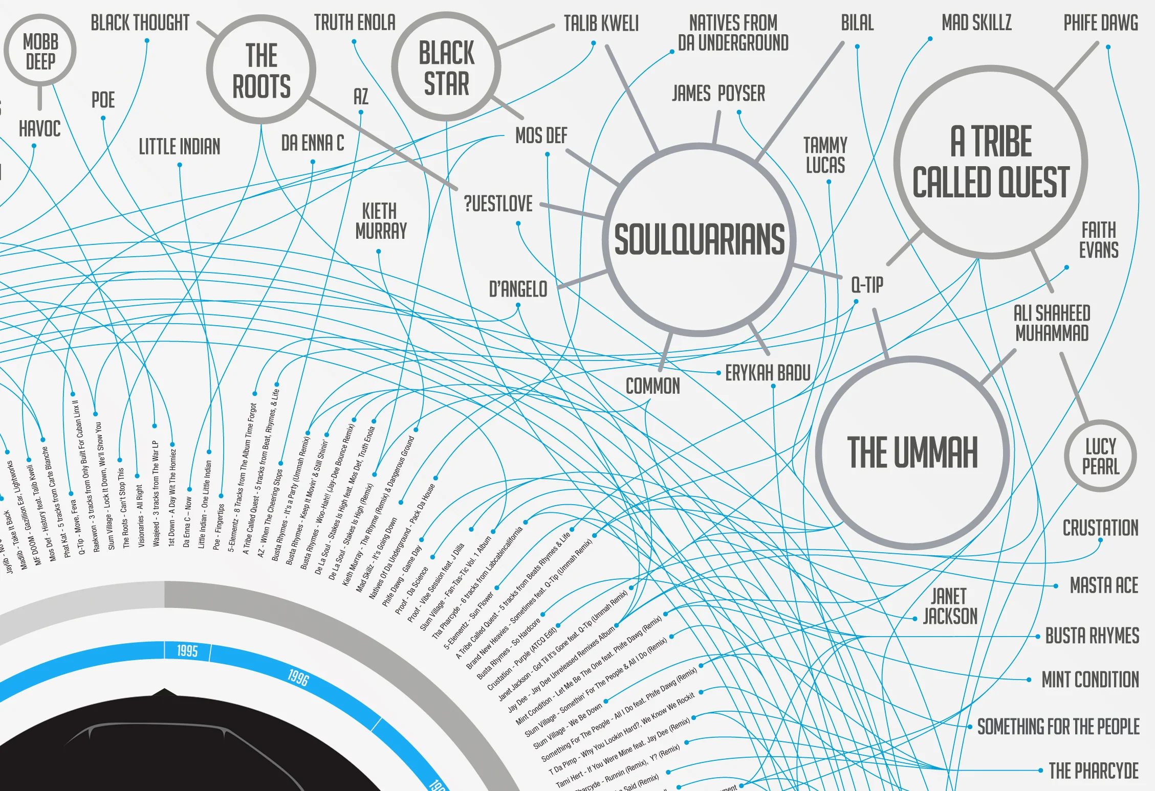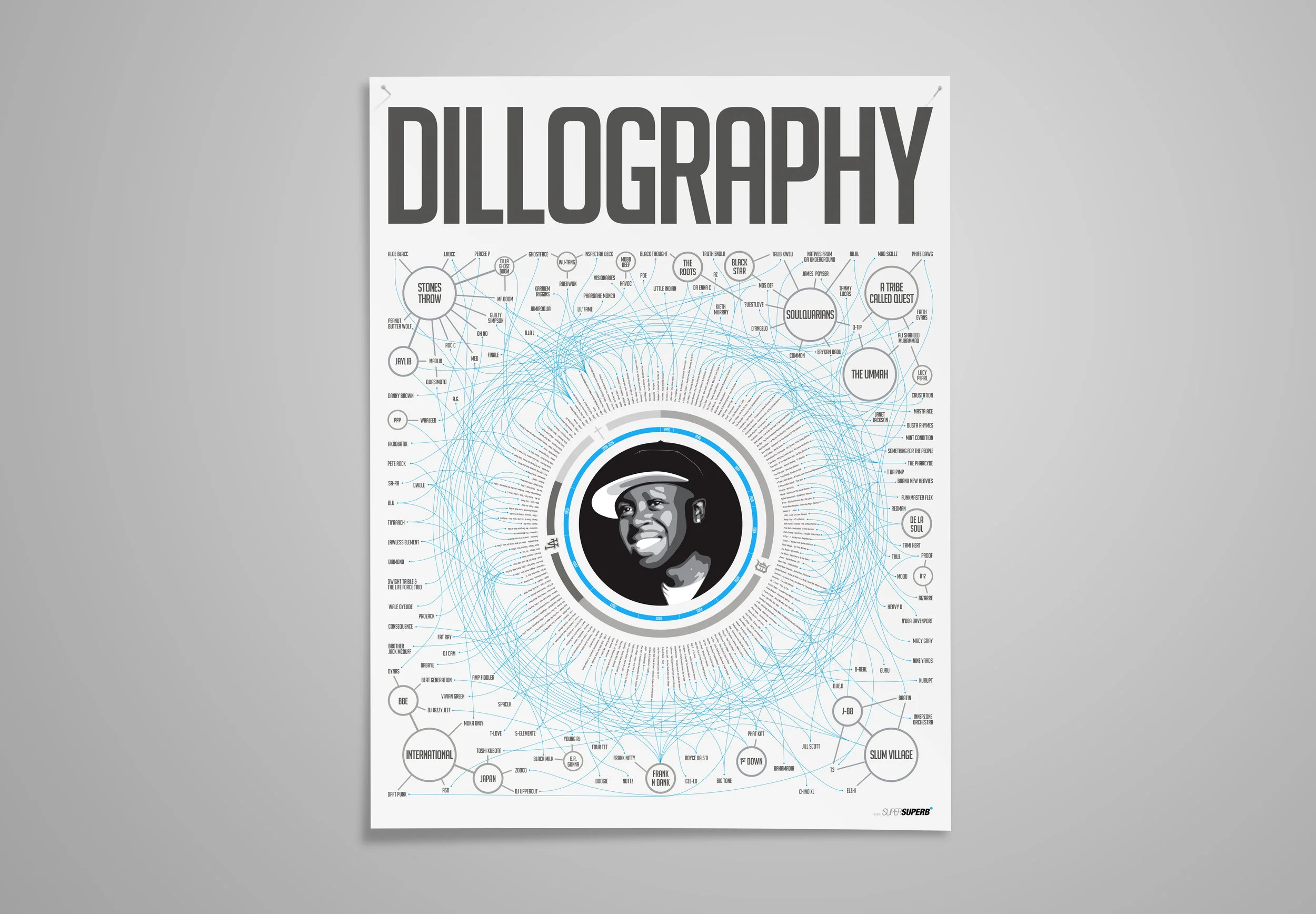 The poster lists every one of his releases by chronological order and location, linking them to all of the artists he worked with and showing how they are connected to each other.